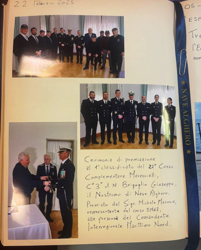 2. Grazie Giuseppe. L’abnegazione di cui sei dotato ti ha portato ad un traguardo, quello che noi EM68 abbiamo premiato, rivedendoci un poco nei nostri giovanili trascorsi e portando in dono, per quel che può servire, una amicizia che rappresenta quanto questa nostra amata Marina può portare. Nel 2008 l’allora Direttore agli studi, C.V. ora Ammiraglio Danilo Longhi, nel presentarci agli allievi in occasione dell’alza bandiera a Mariscuola ebbe a dire che se tra essi, anche solo in due, dopo trent’anni si sarebbero ritrovati amici e fratelli aveva raggiunto il suo scopo. Ne siamo la prova. E le parole dell’Ammiraglio Biaggi hanno avvalorato questo ideale passaggio di consegne. Vai fiero di quanto hai raggiunto, hai un seguito di anziani fratelli che credono in quanto tu hai ottenuto.